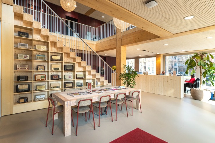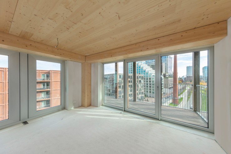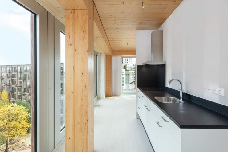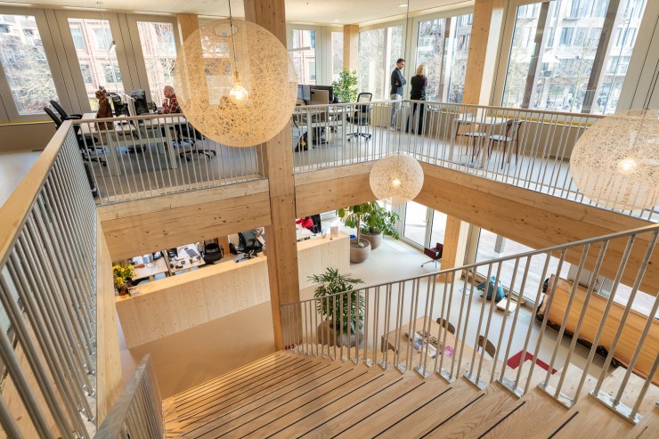 Het gebouw krijgt een betonnen kern waar de lift en het vluchttrappenhuis een plek krijgen. Daaromheen is alles van hout: houten vloeren, houten kolommen en houten balken. Door het toepassen van zoveel hout in een gebouw wordt er in het gebouw meer CO2 opgeslagen dan dat er nodig is om het gebouw te bouwen. We dragen hiermee dus bij aan het terugdringen van het CO2-probleem.