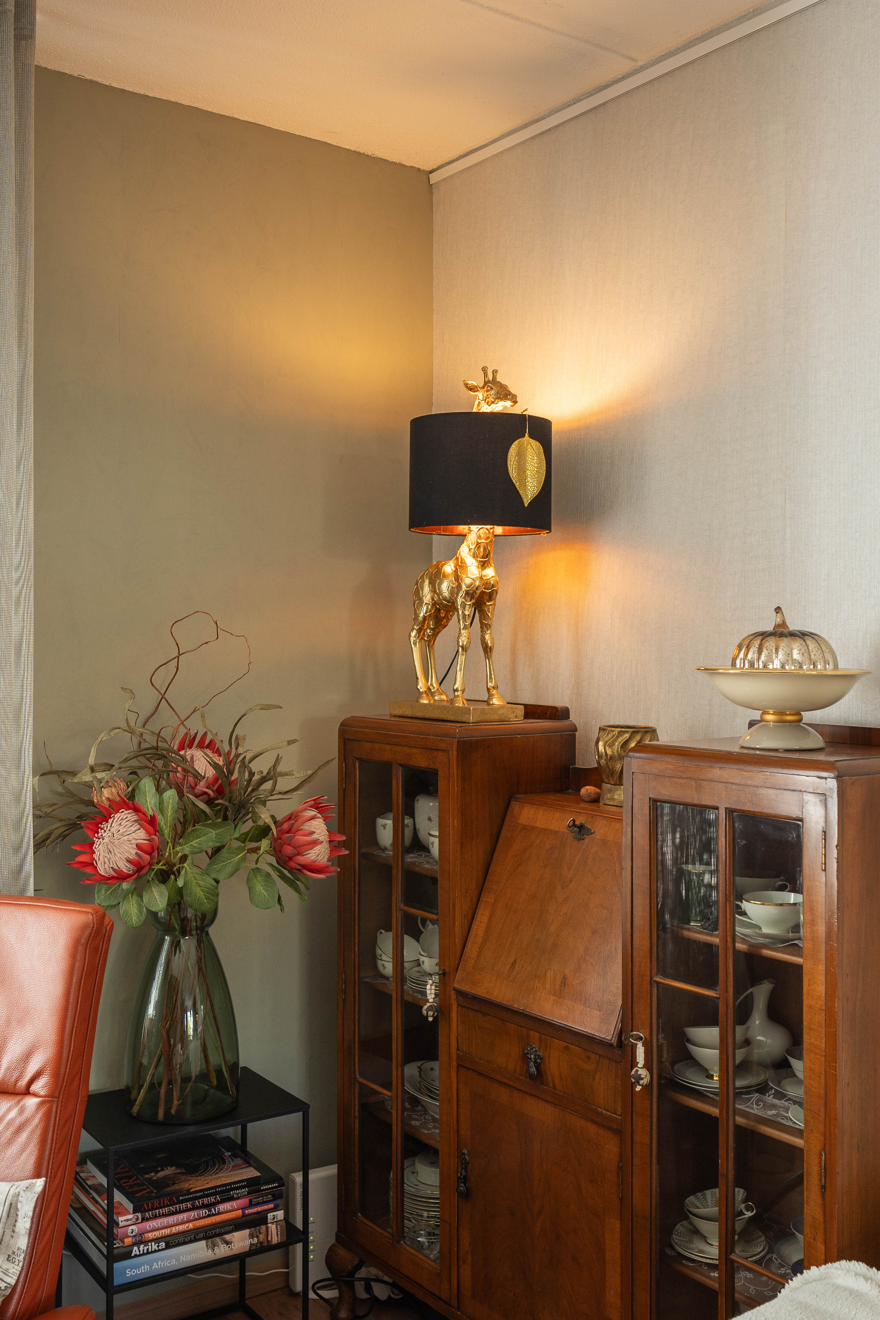 Wie bij Toni over de drempel stapt, merkt meteen dat haar huis meer is dan alleen een plek om te wonen. “Het is echt mijn eigen stek,” glimlacht ze. “De omgeving, de ruimte, de lichtinval, alles klopt gewoon. Binnen heb ik mijn twee culturen samengebracht. In de gang hangen Afrikaanse kunstvoorwerpen, in de woonkamer staat Delfts blauw. En overal staan vetplanten uit Zuid-Afrika, die doen me denken aan mijn jeugd.” Vorig jaar reisde ze met haar zus terug naar het land van haar roots. “We gingen naar Namaqualand, een droog gebied vol vetplanten. Eén keer per jaar – in juli en augustus – staat alles in bloei. Dan zie je alleen maar kleuren. Zo bijzonder. dat beeld draag ik altijd bij me.”