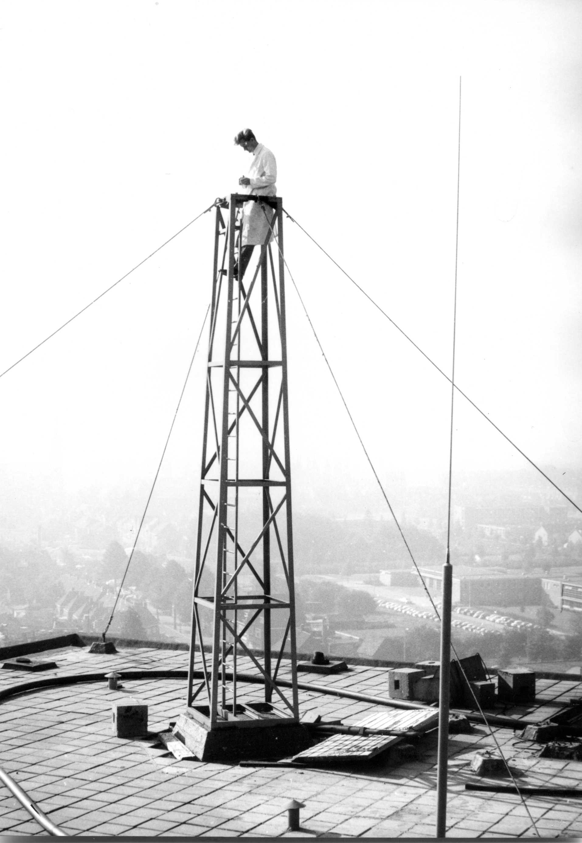 Op de eerste foto zie je Marten de Rapper op de televisietoren op het Veemgebouw. Marten was verbonden aan het Natuurkundig Laboratorium van Philips (bekend als NatLab) in Eindhoven. Hij werkte aan de voorbereiding van de overgang van zwart-wittelevisie naar kleurentelevisie. Achterop de foto schreef Marten: ‘Meneer zelf controleert nog even of alles is voorbereid voor de komst van de antenne.’ In de zomer van 1966 ging het gebeuren! Toen werd de zendmast voor de kleurentelevisie op het Veemgebouw geplaatst.