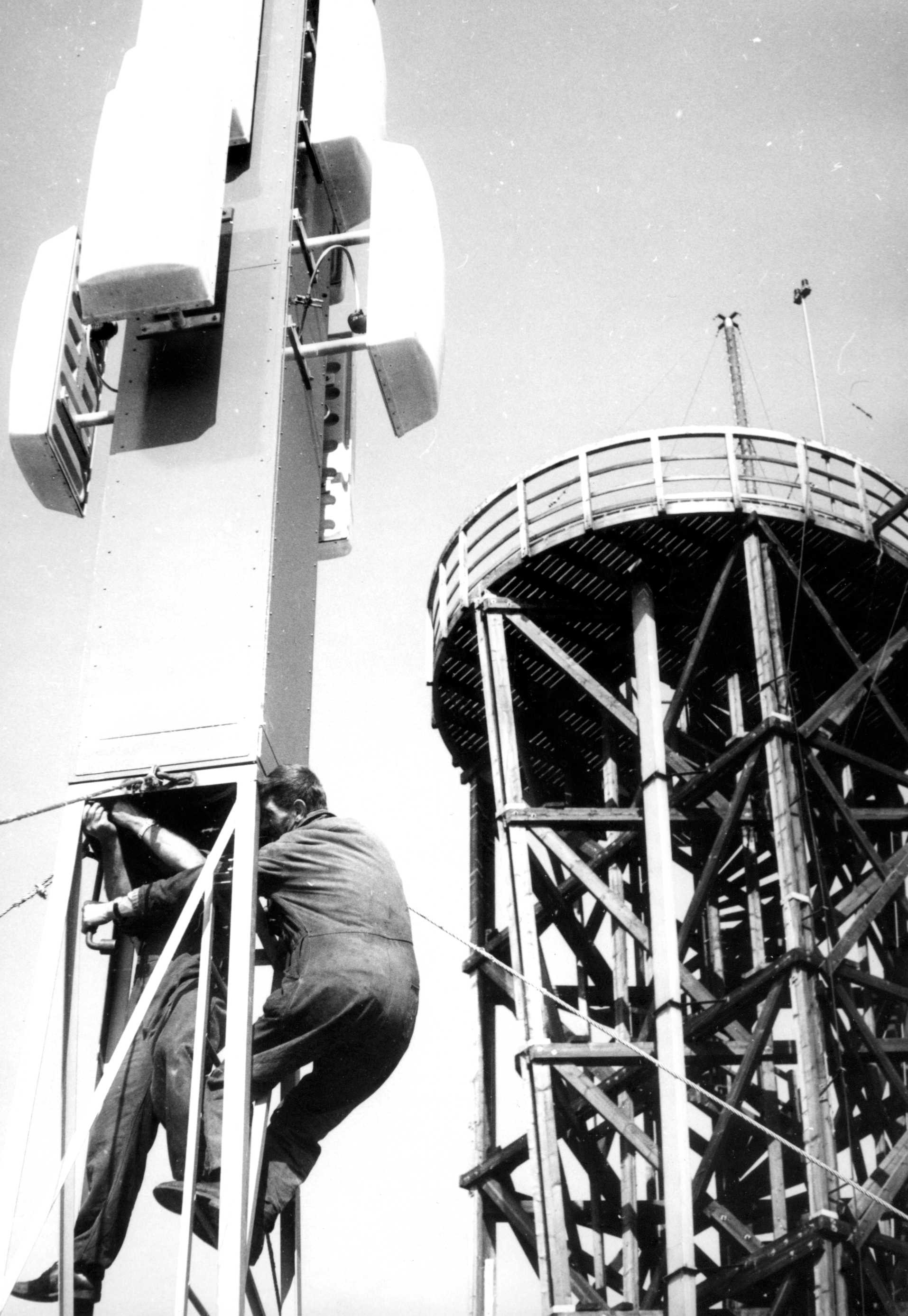 Op de tweede foto zie je twee collega's van Mart. Moesten deze twee mannen geen veiligheidsgordels om? Volgens Mart hoefde dat niet. Hij schreef achterop de foto: ‘Ons gebeurt niks!’ En valt jou ook iets op de foto? Juist! Op de foto zie je de bekende houten zendtoren op de achtergrond. Deze houten toren is in hetzelfde jaar afgebroken.
