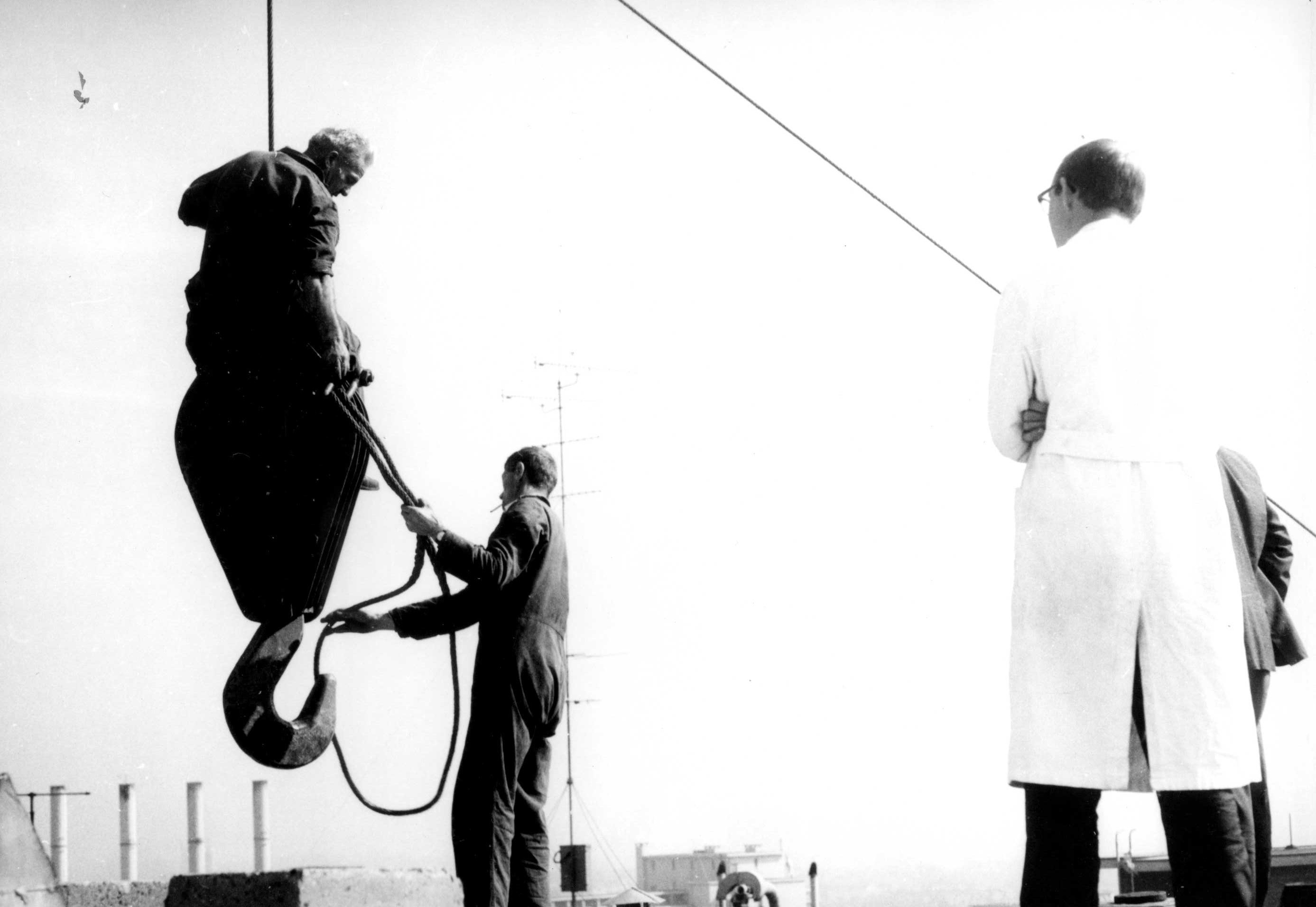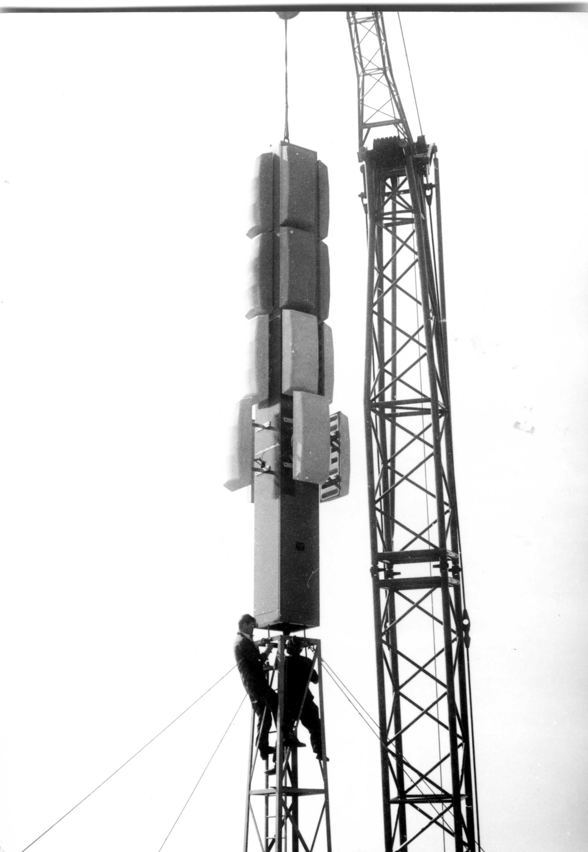 Op de derde foto zie je hoe de zendmast op het Veemgebouw werd geplaatst. Achterop schreef hij: ‘Een imposant hijsoog! Frans Meijer en de opzichter keken toe. Het plaatsen van een antenne met een kraan bleek goedkoper te zijn dan de inzet van een helikopter. De top van de kraan moet toch wel zo'n meter of zestig boven de grond hebben gezeten’. Hadden de mannen hoogtevrees? Geen sprake van!