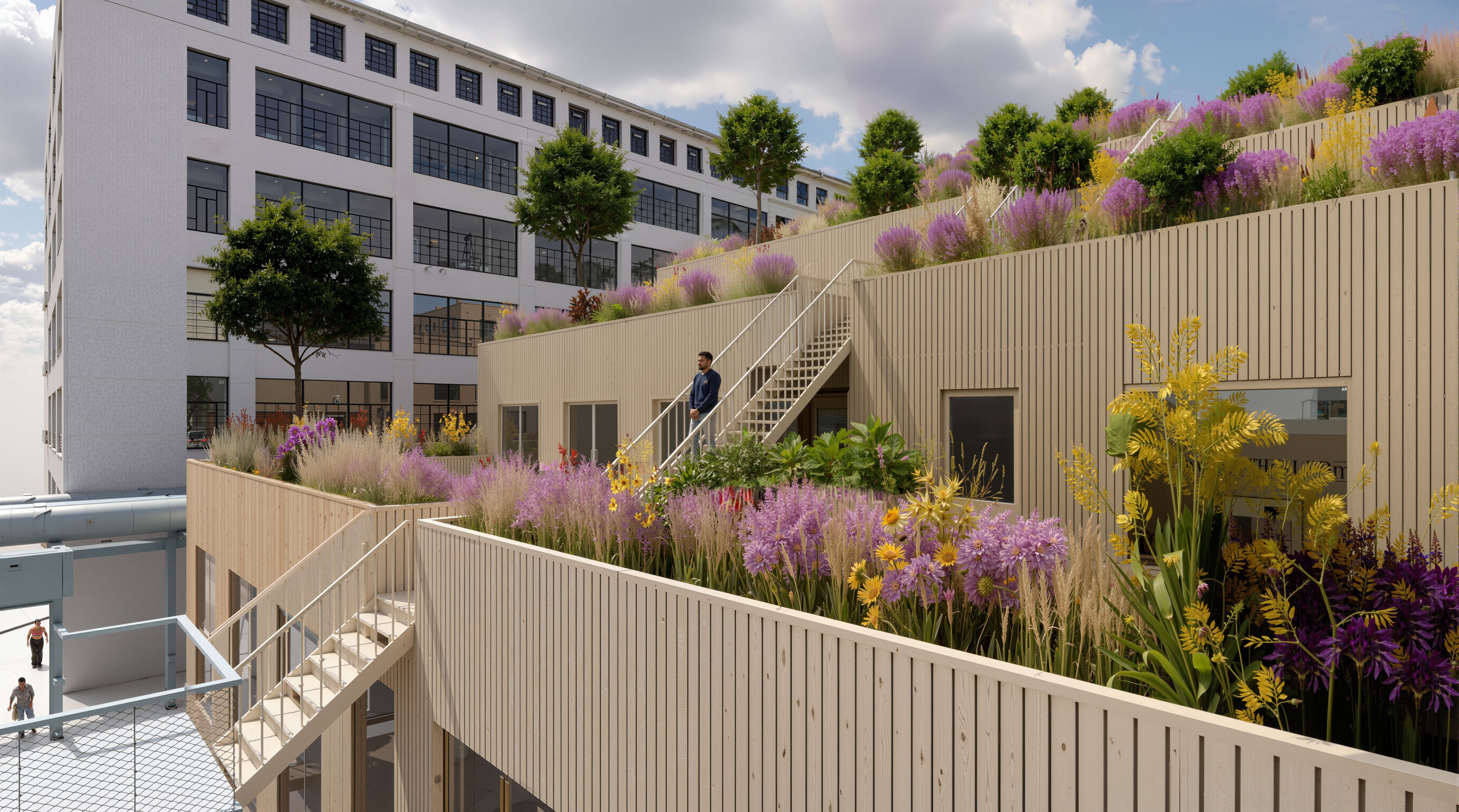 De verschillende lagen van Tribune worden omzoomd met groene plantenbakken. Op de terrassen is ruimte voor opgaand groen, zoals bomen of heesters, en sedumplanten. De traptreden van het gebouw worden niet openbaar toegankelijk maar dienen als vluchtweg voor de appartementen.